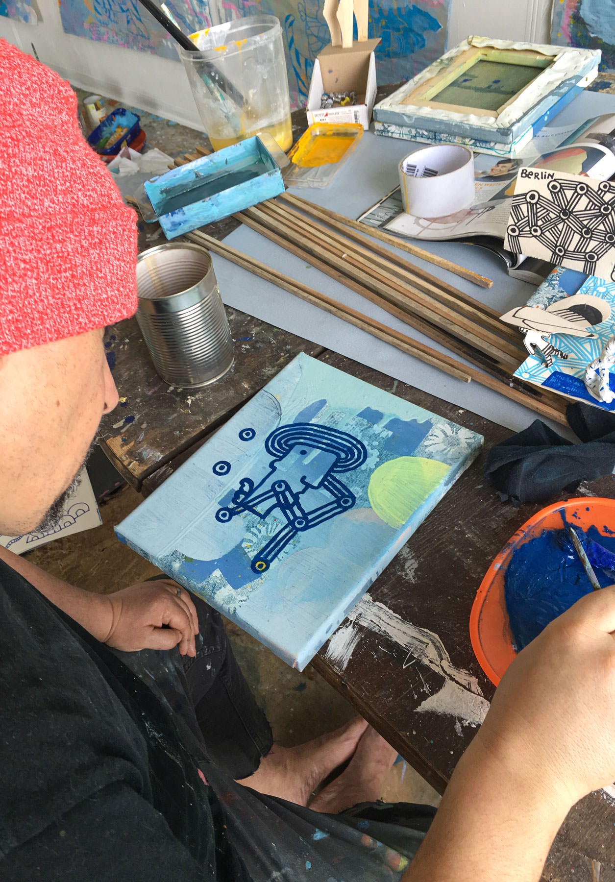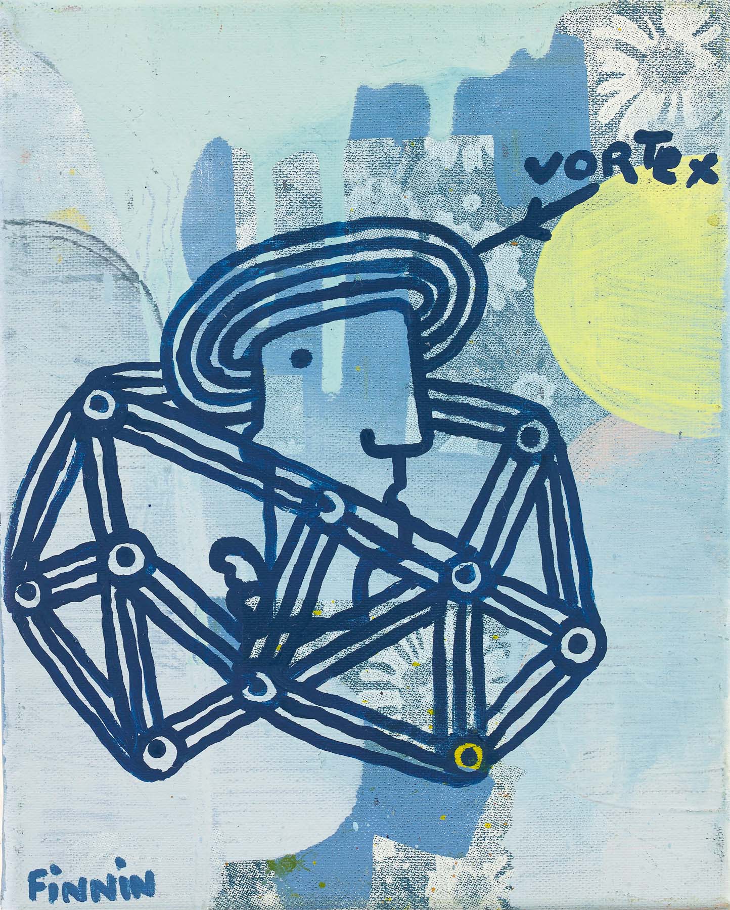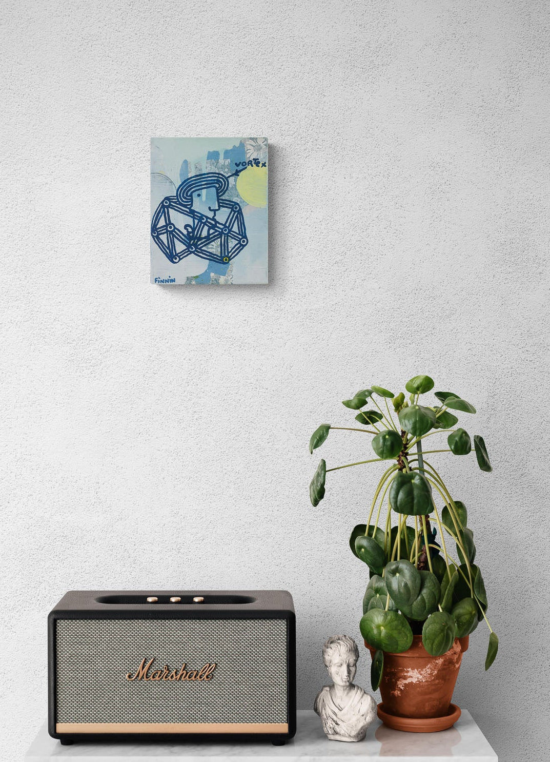 This canvas began with a printed floral pattern taken from Berlin wallpaper, laid down in blue. It’s interesting how nature appears here only as a trace, gathered within an urban setting. The network of lines represents the structures of the mind, the conditioning that shapes how we see. The figure peers out through a small opening, curious about what lies beyond the habitual. The vortex, that’s another story.