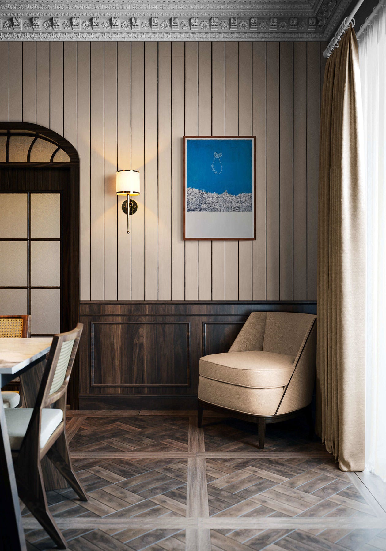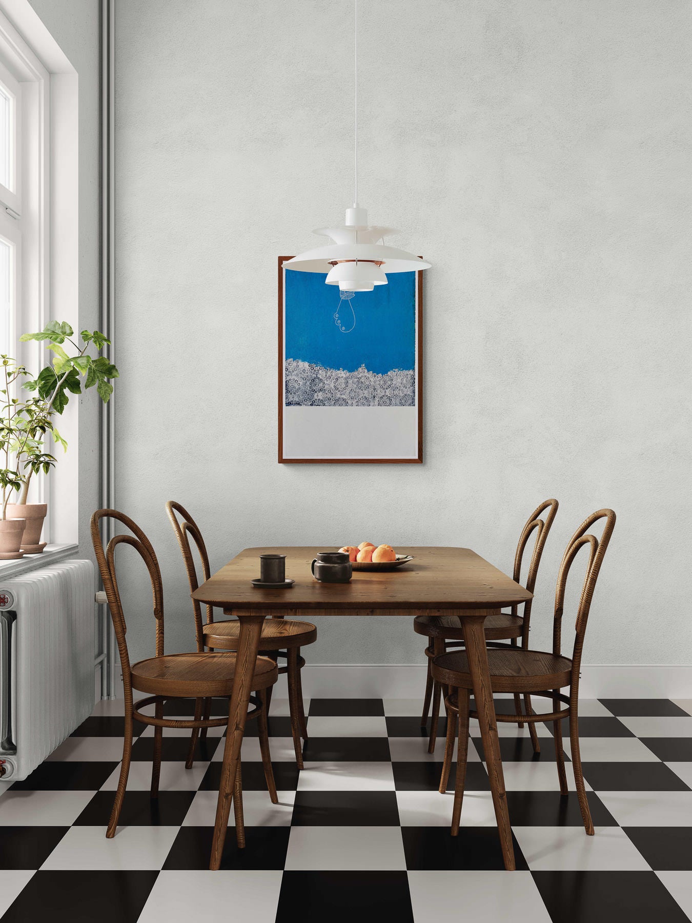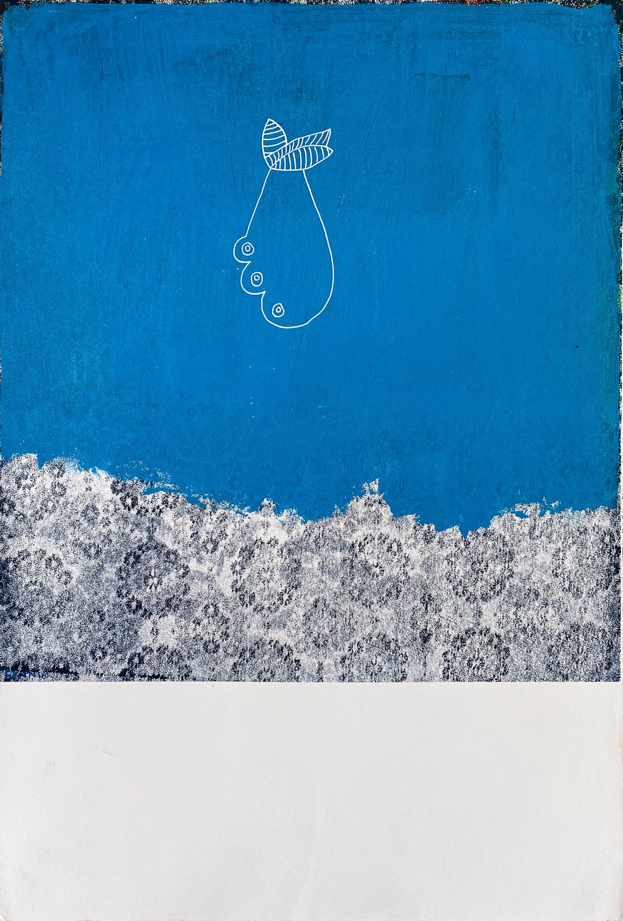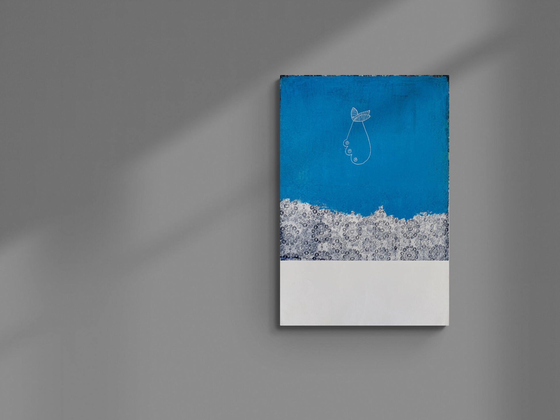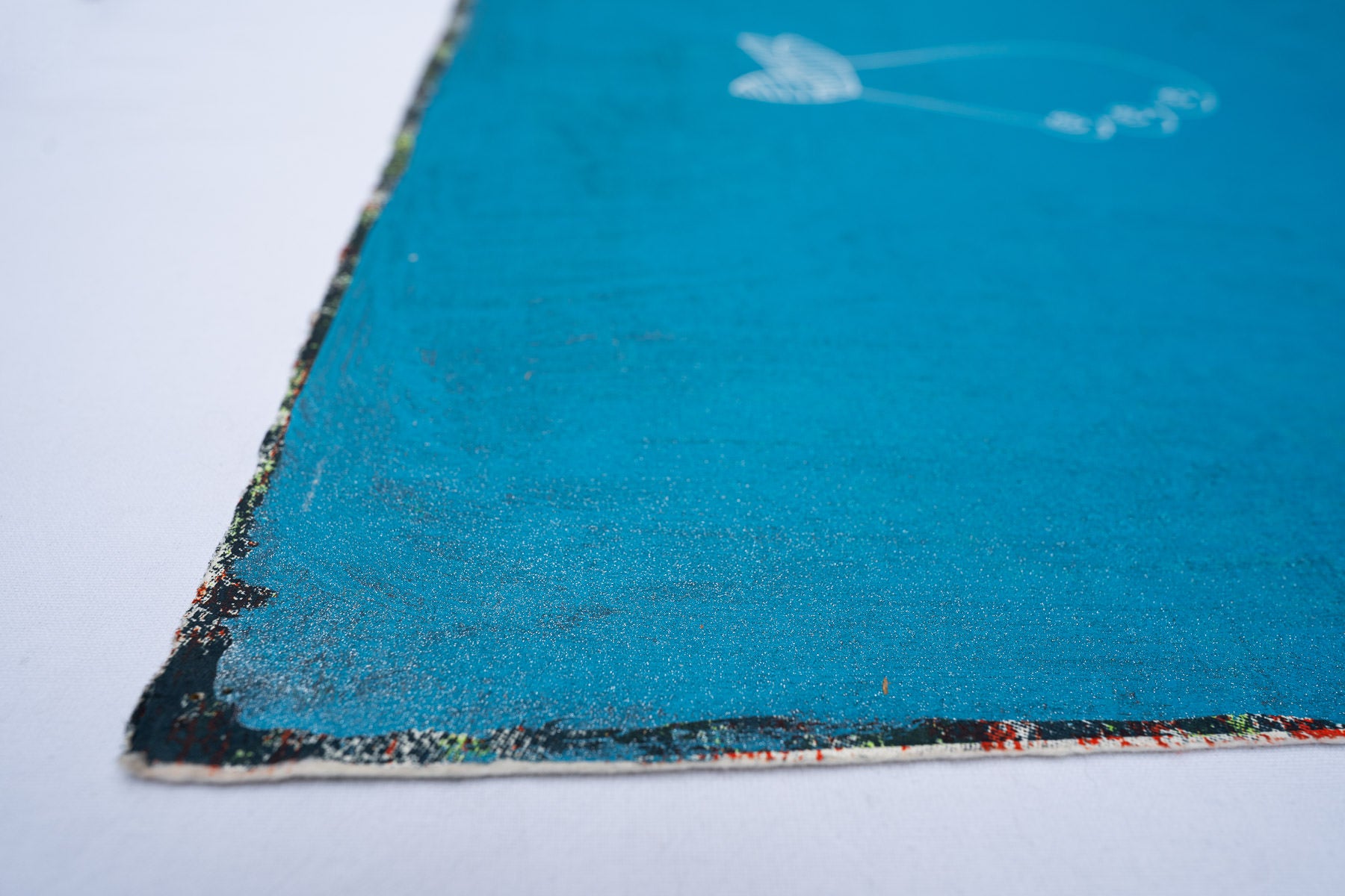 Set against a soft grey Berlin wallpaper pattern, this piece carries a layered history. Beneath the surface lie several abandoned starts, later covered with a shimmering blue mixed with fine glitter. The central abstract form was inspired by fresco paintings in Florence, particularly Masaccio’s work in the Brancacci Chapel.