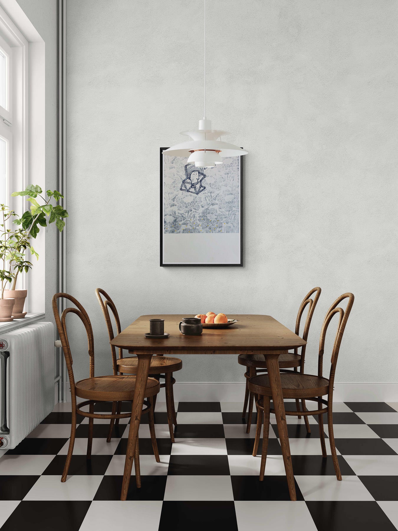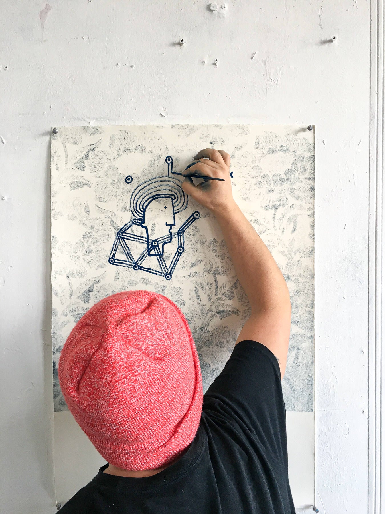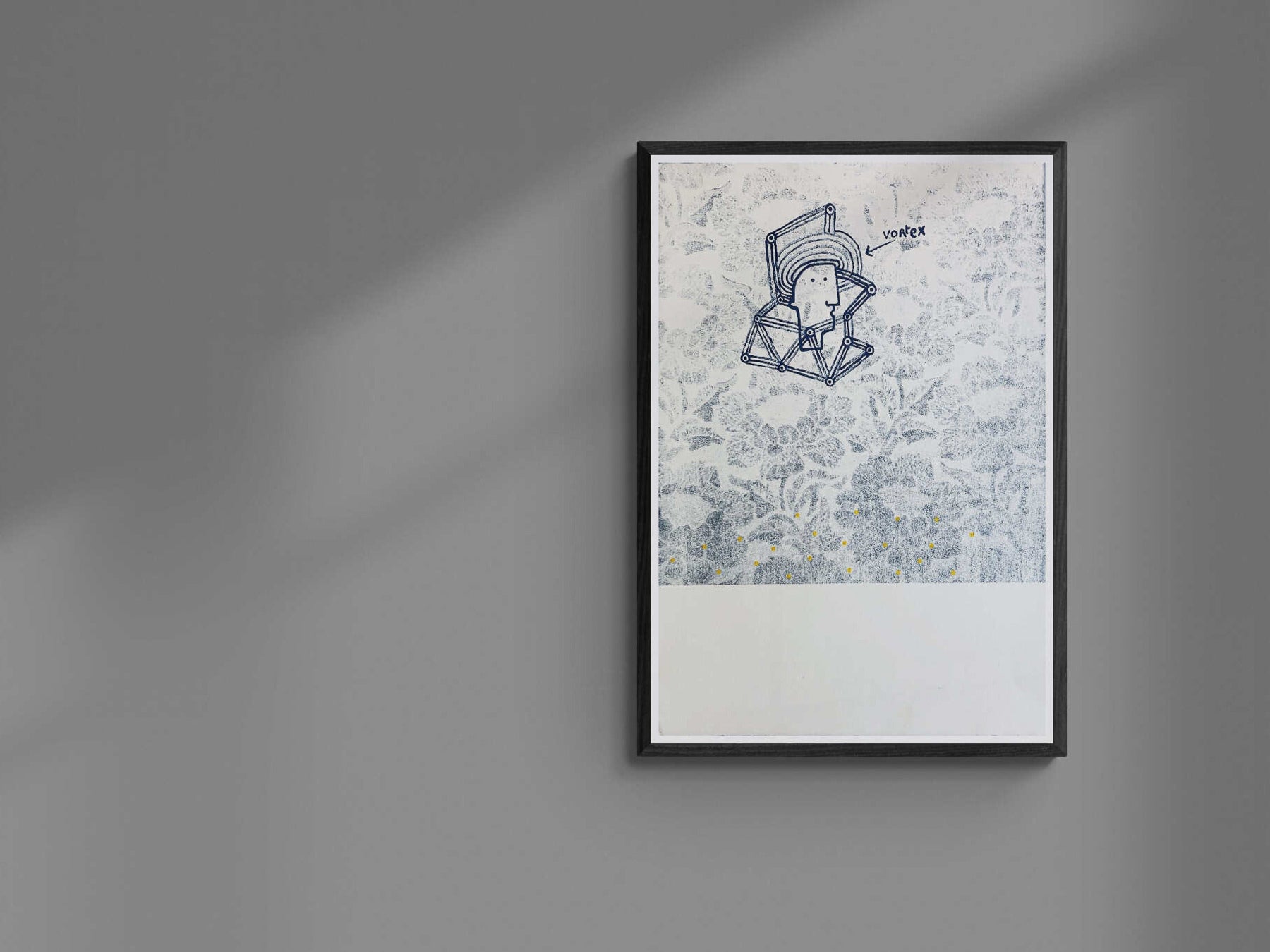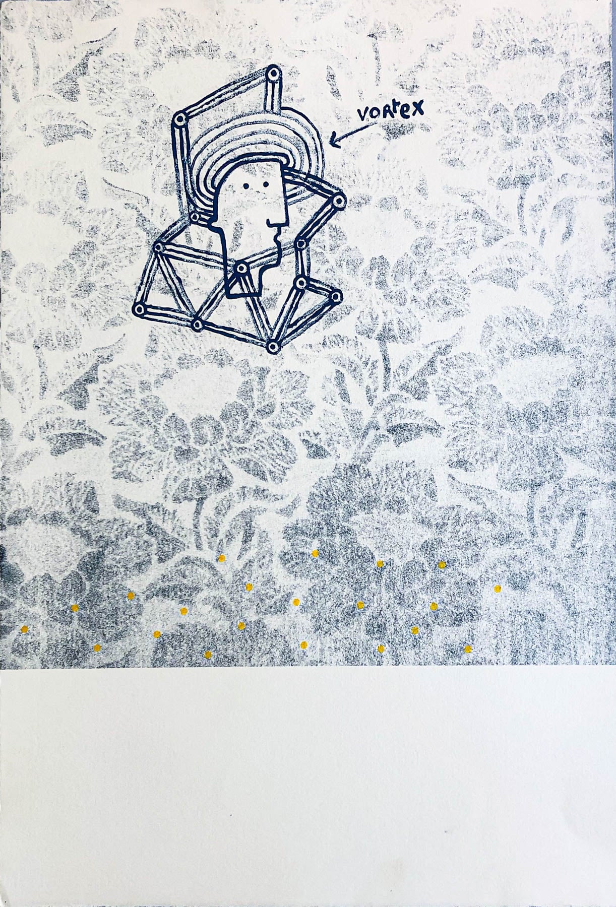 My studio in Berlin was one of the warmest I’ve ever worked in, even as snow fell outside. I made this piece during that time, using ink and acrylic over a printed floral wallpaper pattern inspired by the old East-Berlin studio building. The figure and its cage came together quickly and felt unlike anything I’d done before—edgier, more uncertain. When I look at it now, I still wonder whether the figure will leave before the door closes.