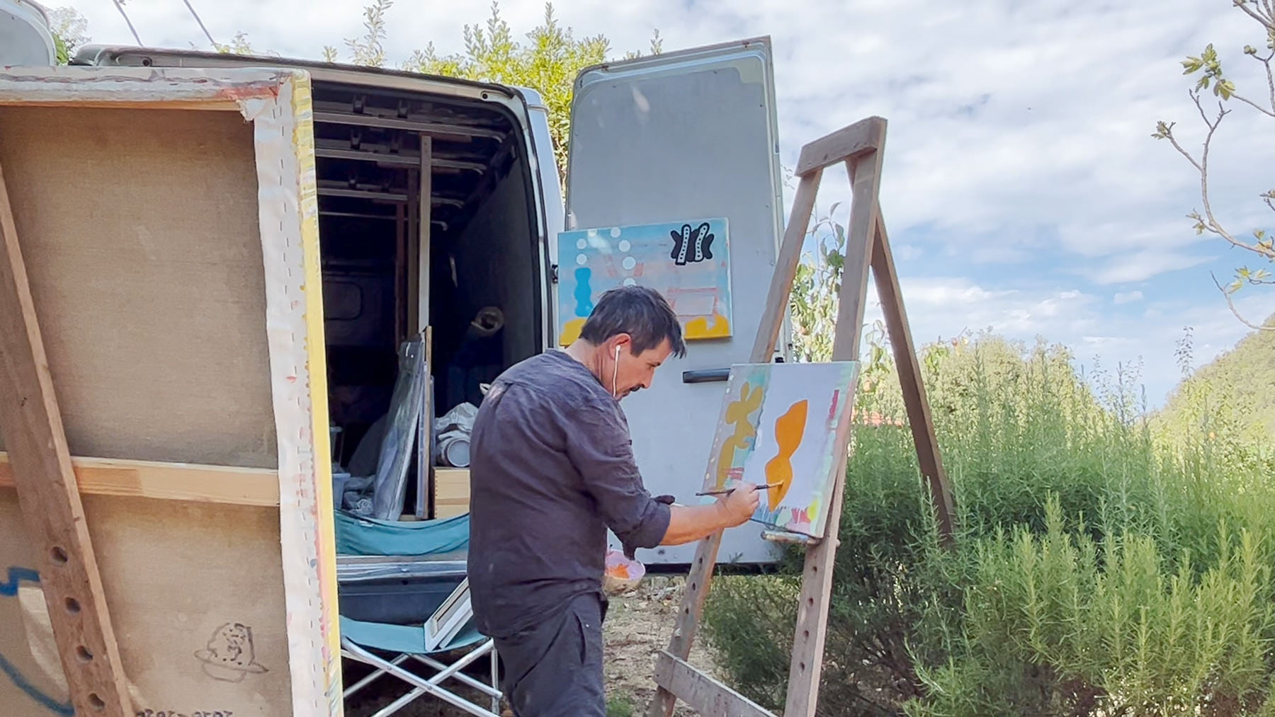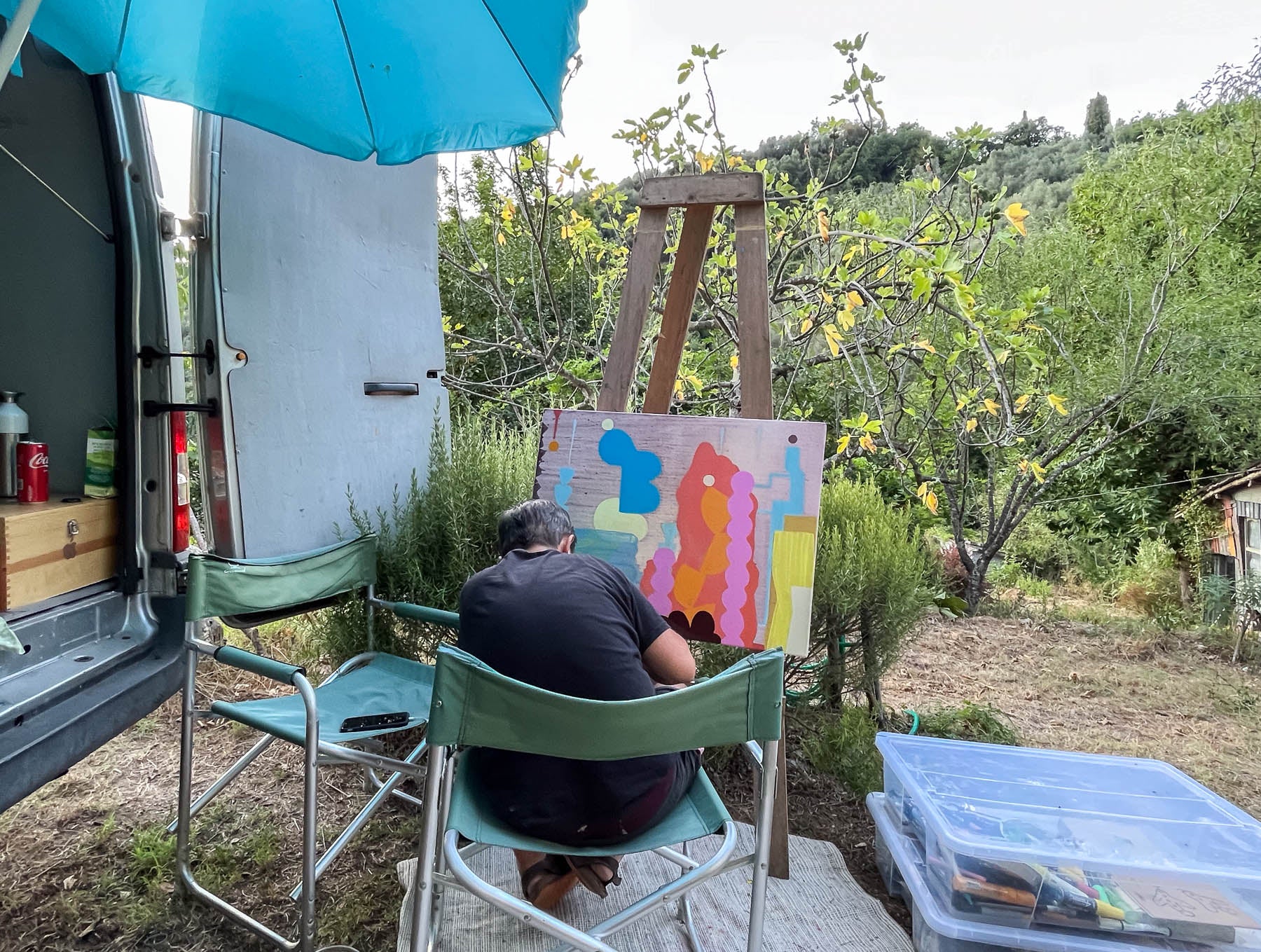 This painting began as an observation of the Italian landscape. I wanted to use paint in all its forms, splashing, staining, brushing, and wiping. The depth in the background came from building layers slowly, letting them dry for weeks before rubbing them back and starting again. All of my canvas works are painted in oil, a patient but demanding medium. It can take days or weeks between layers, but it rewards time with a sense of atmosphere that feels alive.