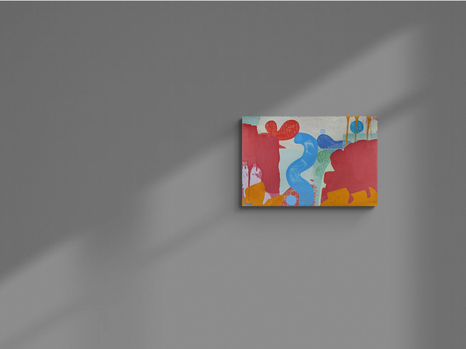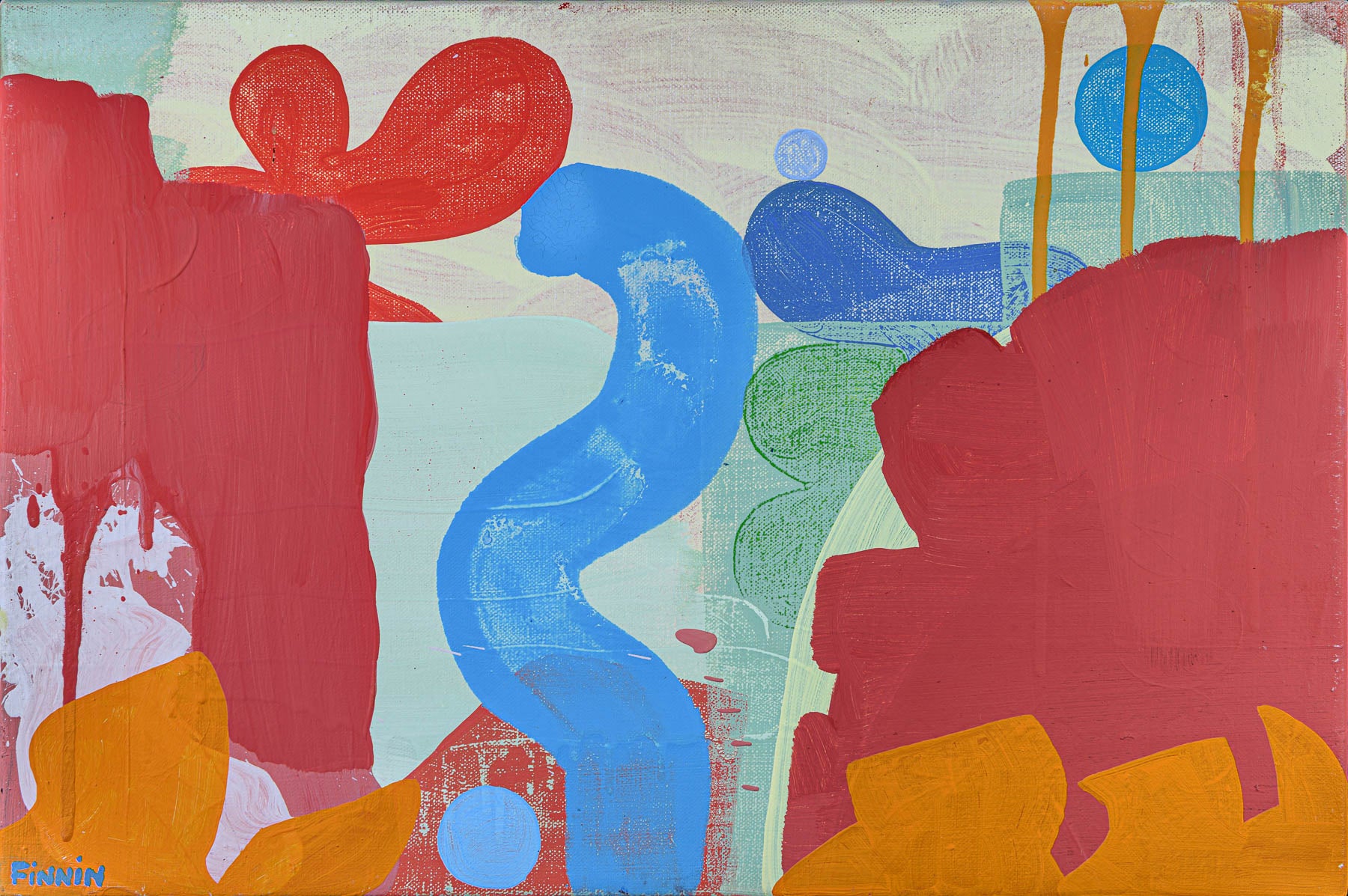 Painted under the Italian sun, this work captures both the calm and volatility of the landscape. A blue swirl runs through the centre like a stream turning into a waterfall, while orange structural forms rise like flames in the foreground. Layers of paint are brushed, stained, and wiped back to create distance, rhythm, and tension.